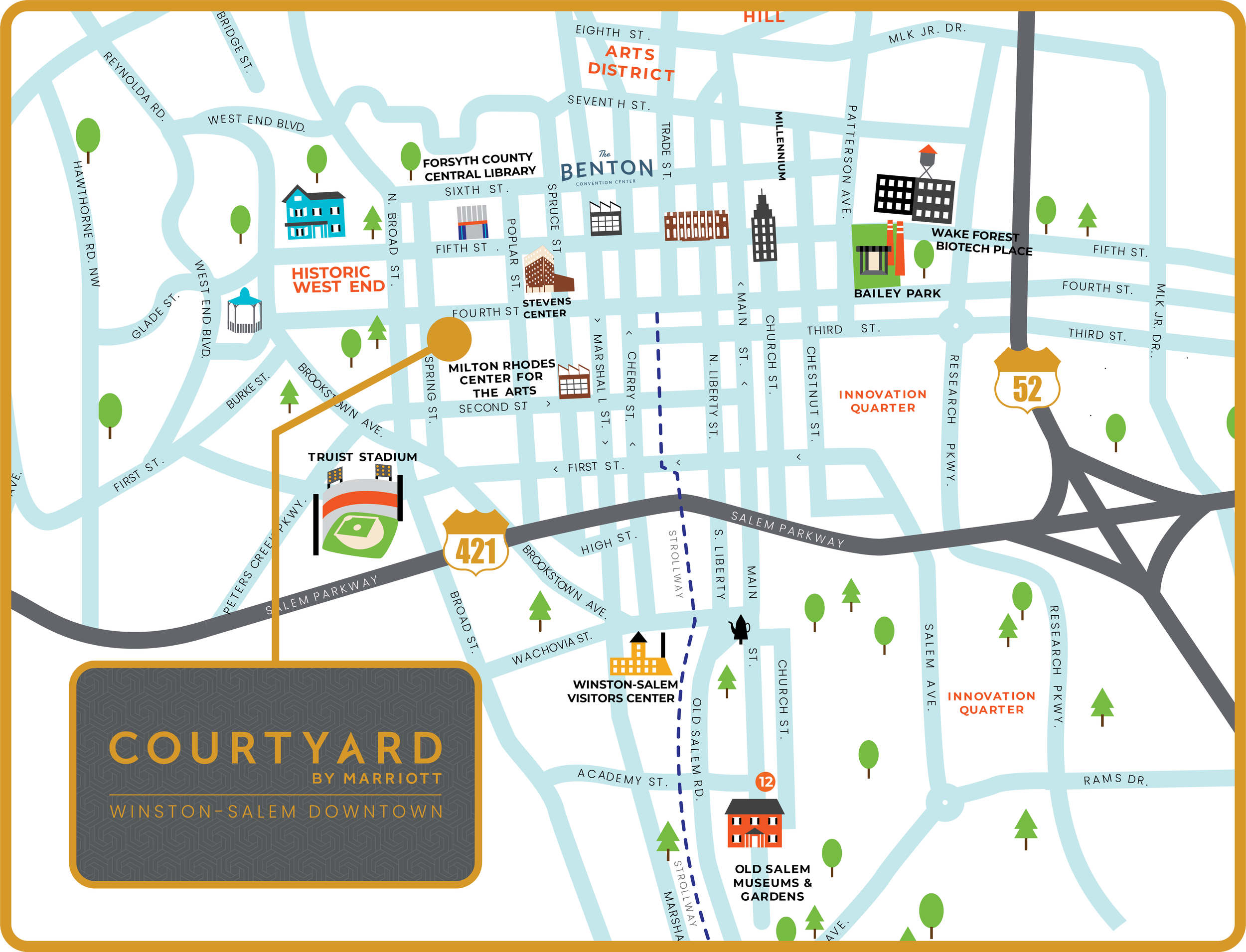 Hodges Ward Elliott (“HWE”) is pleased to present the opportunity to acquire the fee-simple interest in the 126-key Courtyard Winston-Salem Downtown. The 2020-built Property is located in the city’s downtown core and main employment corridor, walkable to a wide array of retail and amenities. Also positioned less than 10 minutes from Wake Forest University and less than five minutes from the groundbreaking Innovation Quarter, the region’s leading technology hub, the Courtyard is surrounded by market-leading demand generators.